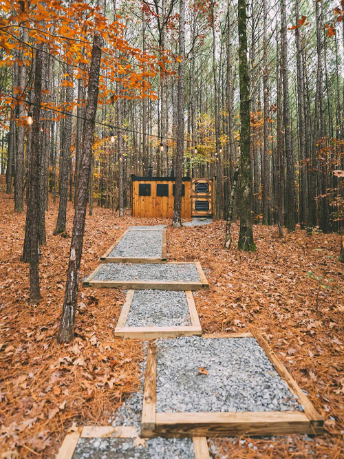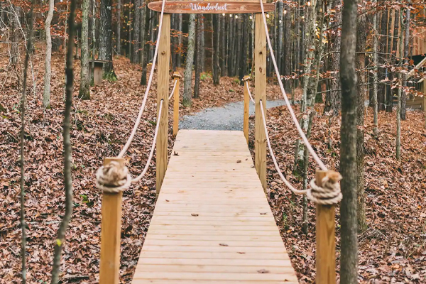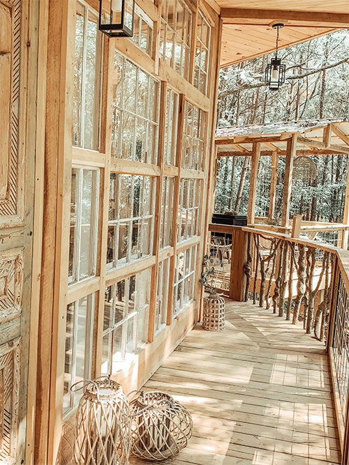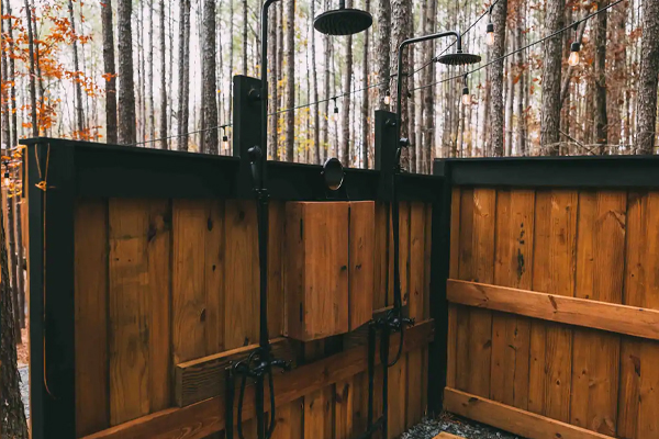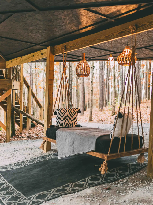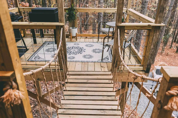 There is a walkway bridge to the main house and then another to the deck overlooking the fire pit. A short path leads to the outdoor double showers and, yes, there is hot water. The showers are enclosed, but you’re surrounded by woods so the area is quite private. In addition there is a swing bench under the treehouse for some extra lounging.