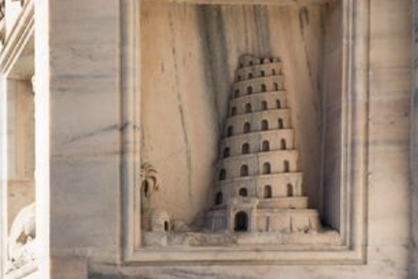 Ornate relief on facade of Milan Cathehdral in Italy showing the Babel tower.