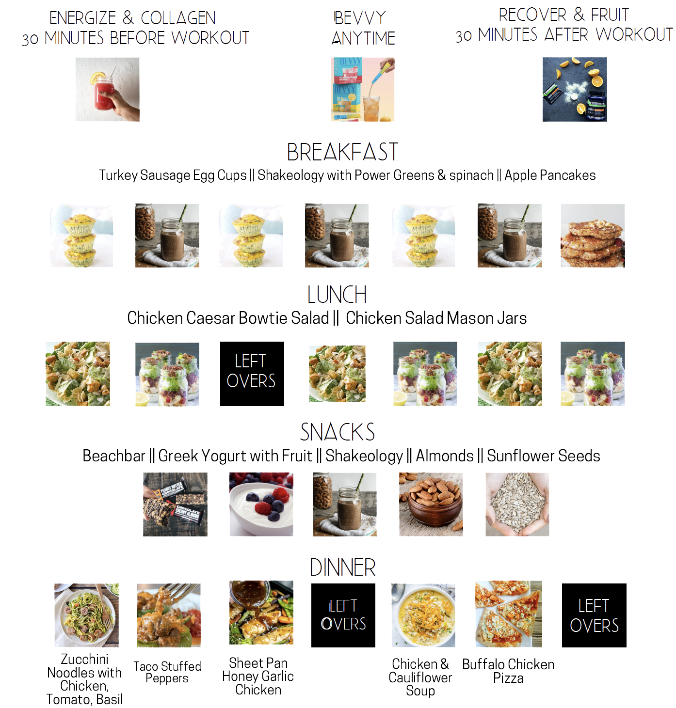 • These meal plans take into account that you are incorporating Shakeology, collagen, Energze, Recover and Beachbars. If you are missing any supplements and need or wish to try them, connect with me!