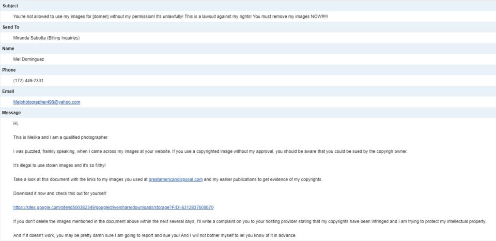 In the recent variation, an accusation is made (submitted through a form on your website) that you are using photos or artwork in violation of copyright. When you receive something like this, you can always double check your content on your own, or check with anyone responsible for adding content to your website. But never click a link or download anything from the accuser, never assume they are operating on good faith. (If your website is with us, you can also reach out to us for confirmation.)