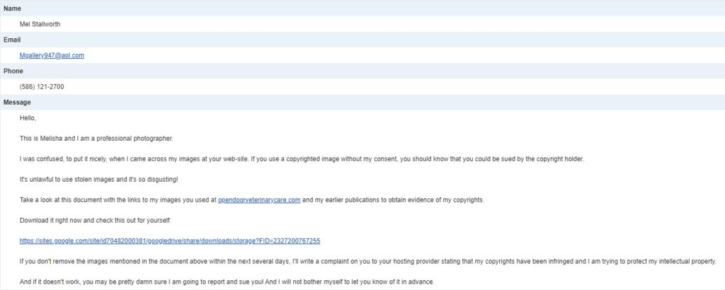 Take a look at this document with the links to my images you used at opendoorveterinarycare.com and my earlier publications to obtain evidence of my copyrights.