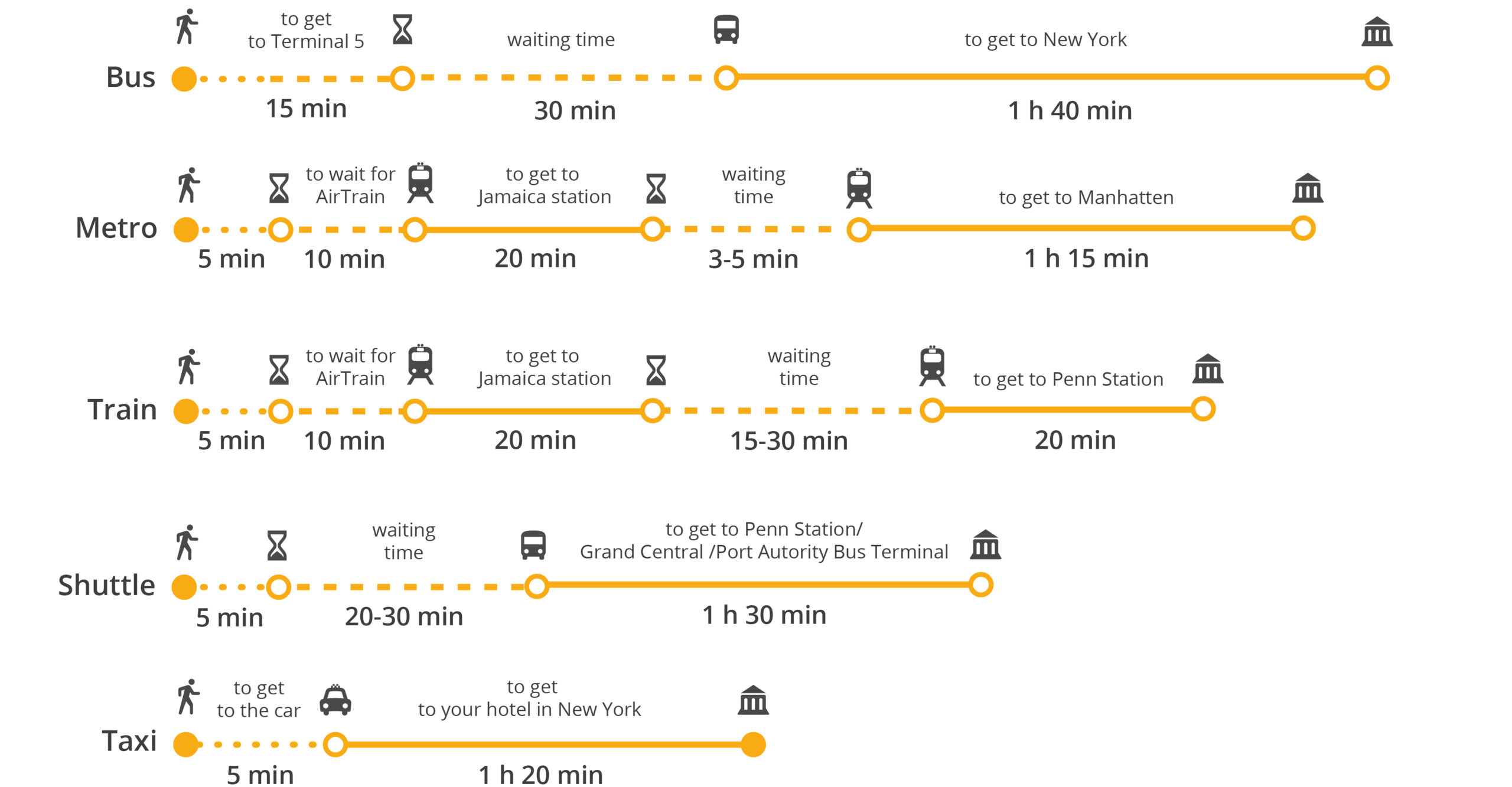 If you are in New York for the first time and are afraid of getting lost, or you are traveling with your family or have lots of luggage, then you will not probably want to travel by public transport. The best travel option for you will be a private transfer or a taxi from JFK: the driver will not only meet you at the airport and lead you to the car, but also help you with your luggage. The duration of such a journey is 1 hour 20 minutes, the journey cost is $163 for an Economy-class car and $188 for a minibus up to 7 passengers.